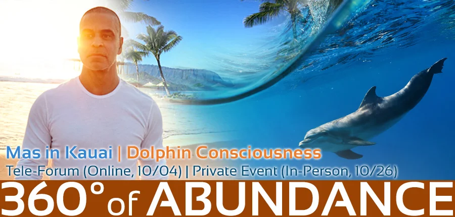This will be an intimate spiritual event of no more than 20 guests at the Dolphin Touch Retreat Center on Kauai. Mas will lead a special Dolphin Consciousness Meditation, which will expand beyond the physical human filters to bring in the purest frequency of the dolphins for you. You will experience the essence and wisdom of these special animals and deepen your understanding of their consciousness, while fortifying your special connection with them both at the heart and spirit level.